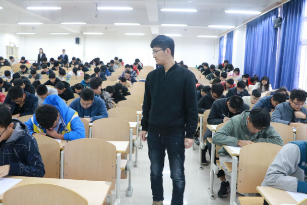 上午8时45分,在工作人员的引导下,同学们在指定位置对号入座并核对信息;上午9时,考试正式开始。五个考场内安静有序,同学们都即刻进入了紧张的答题状态。考场上,同学们沉着应对、冷静分析、细心答题并严格遵守考场秩序;监考人员公正无私、尽职尽责。期间,17级新生辅导员张富生老师和孙士强老师进行考场巡查,在巡视的过程中欣慰于学生们均态度端正,认真答题,考场秩序井然。